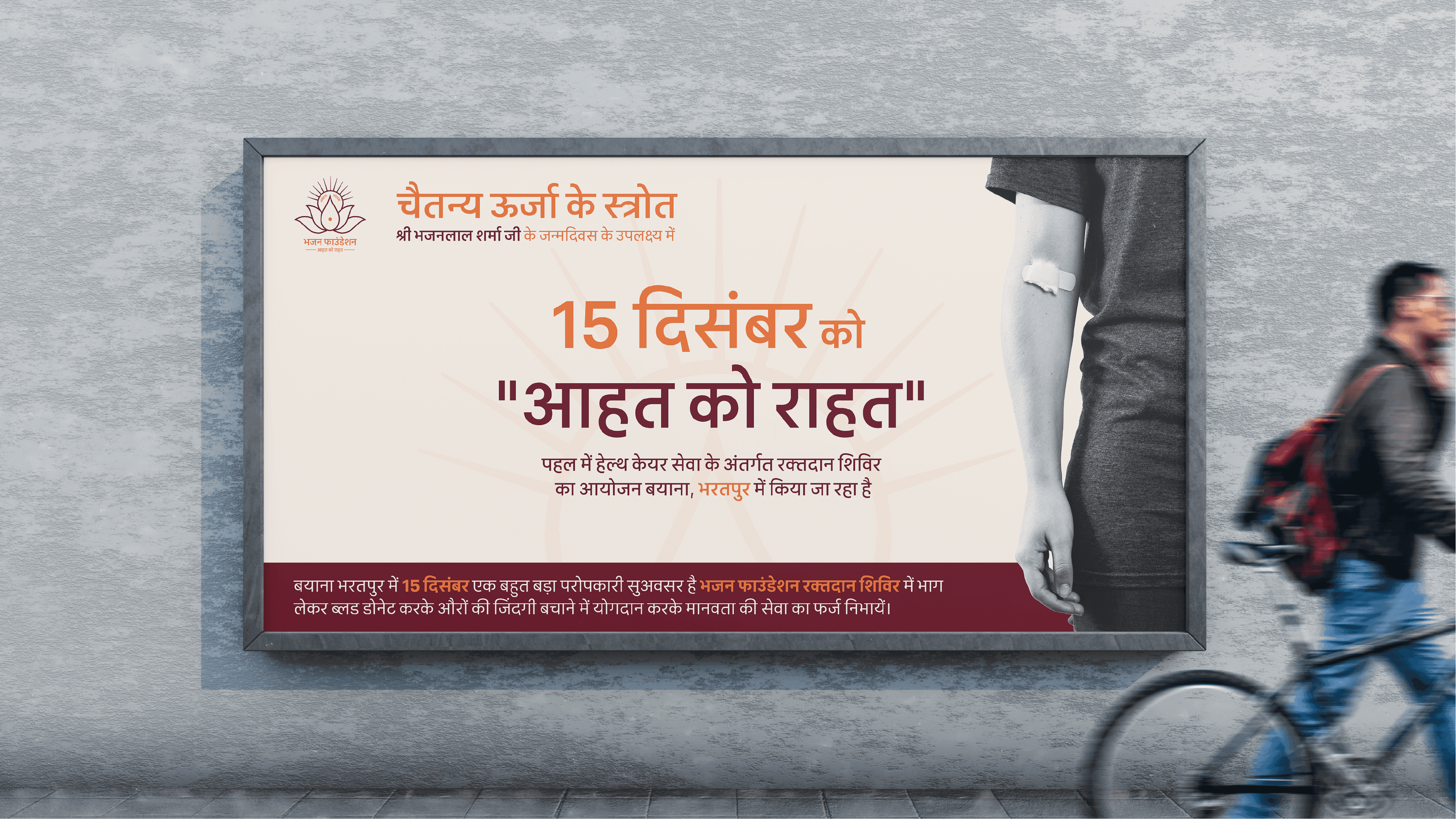 The Bhajan Foundation is a philanthropic organization dedicated to alleviating suffering and promoting holistic development across India. Guided by the principle "आहत को राहत" (Relief to the Afflicted), the foundation operates across diverse sectors including food security, healthcare, education, environmental conservation, agriculture, human rights, and spiritual well-being.