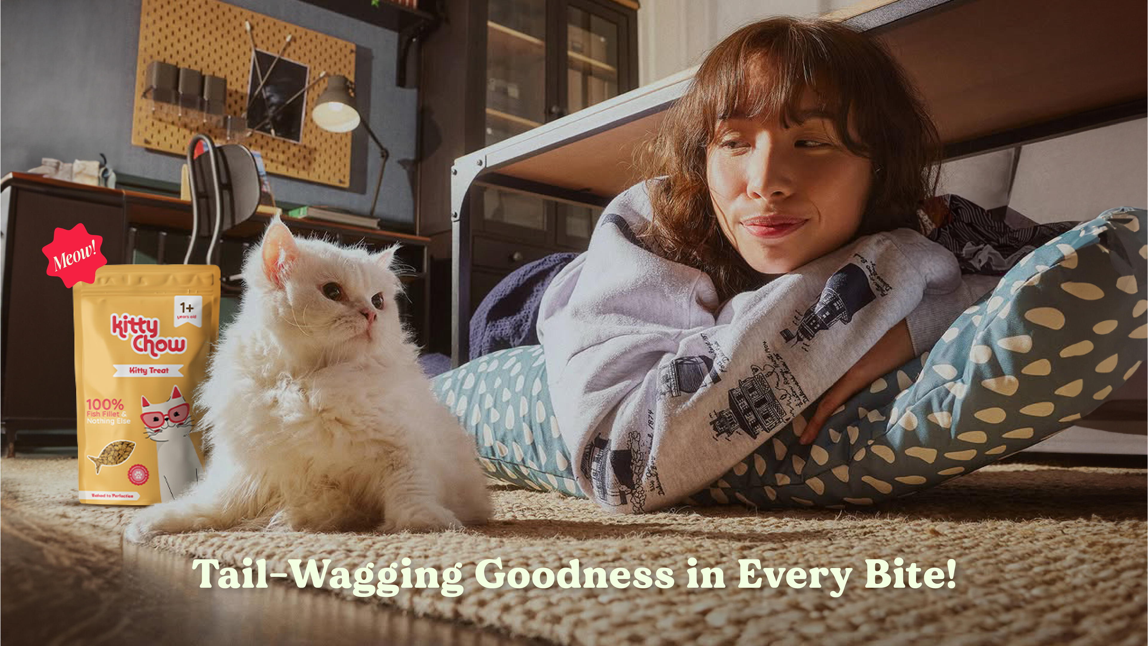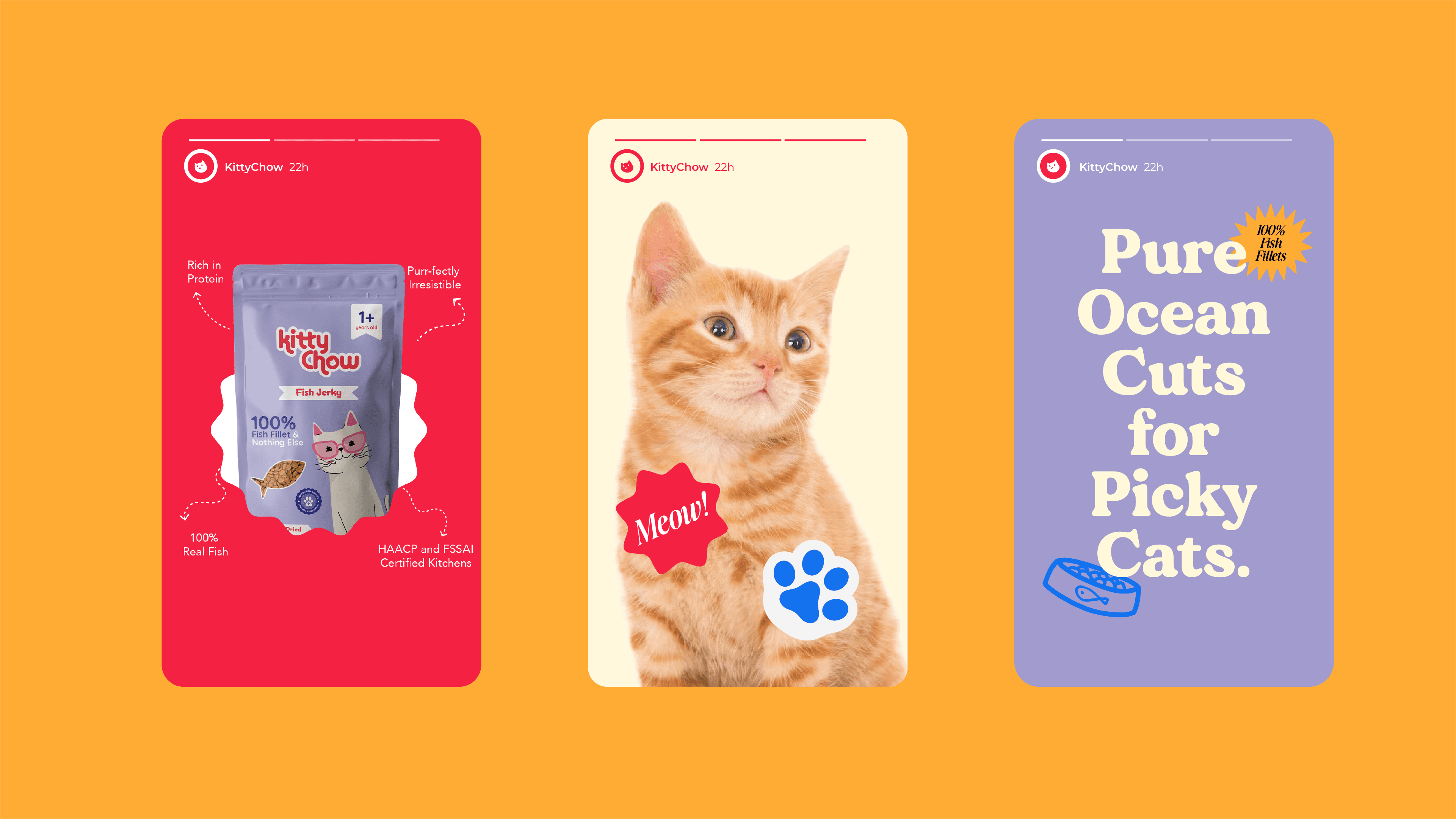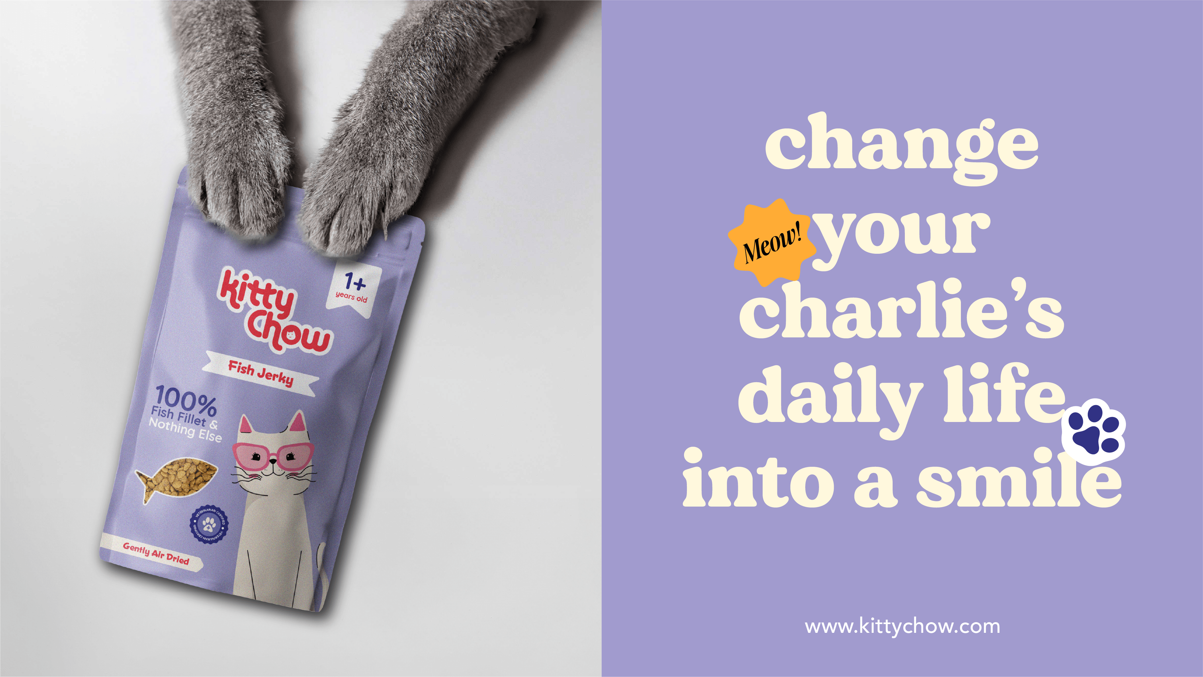 Kittychow is a playful and premium cat food brand designed to celebrate the quirky, lovable spirit of cats while ensuring their nutrition is never compromised. With a fun, vibrant visual identity and a tone that blends affection with modern pet care, the branding focuses on appealing to young, urban pet parents.